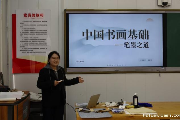 在书法绘画兴趣小组首场课程,艺术设计学院郭晓婷老师以《中国书画基础——笔墨之道》为主题,带领大家走进传统书画水墨世界。郭老师从执笔的方法讲起,详细讲解中锋、侧锋等笔法技巧以及“焦、浓、重、淡、清”五色用墨的方法,结合自己的作品,带领大家感受水墨画的意境。