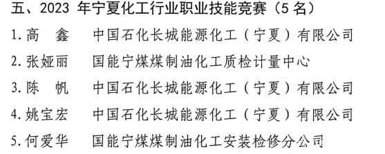 2023年12月27日“自治区人力资源和社会保障厅关于对2023年度职业技能竞赛成绩优异选手认定为自治区技术能手的通知”(宁人社函【2023】375号)文件中,我校安全技术与管理专业群18级应用化工技术专业毕业生高鑫、18级煤化工技术专业毕业生陈帆在2023年宁夏化工行业职业技能竞赛中代表中国石化长城能源化工(宁夏)有限公司参赛队比赛,分别获得化工总控工和工业废水处理工个人成绩第一名,根据《宁夏职业技能竞赛管理办法》被授予且认定为“自治区技术能手”,并破格晋升为技师且被公司聘任为技师职位,享受技师工资补贴待遇,至此,双高建设三年来,我校安全技术与管理专业群“职业技能竞赛团队”的毕业生实习就业后,以扎实的专业知识、精湛的专业技能、良好的竞赛素养,经过企业层层严格选拔,最后脱颖而出,先后入选中国石化长城能源化工(宁夏)有限公司、国家能源集团宁夏煤业集团公司、四川泸天化集团宁夏和宁化学有限公司等企业代表队奋战在全国石油化工行业职业技能大赛、宁夏化工行业技能大赛、国家能源集团技能大赛、四川省化工行业技能大赛等企业国赛、省赛、企业技能大赛赛场,先后获得全国石油化工行业职业技能大赛化工总控工二等奖2人、三等奖3人、国家能源集团技能大赛化工总控工三等奖3人,宁夏化工行业技能大赛化工总控工一等奖2人、二等奖1人、三等奖3人,工业废水处理工一等奖1人,四川省化工行业技能大赛化工总控工二等奖1人,三年来共获得“自治区技术能手”3人、国家能源集团“青年岗位技术能手”1人,国家能源集团宁夏煤业集团公司“宁煤工匠”1人,国家能源集团宁夏煤业集团公司“青年岗位技术能手1人”,“宁东工匠”1人,bv伟德国际官方入口化工专业毕业生厚植“三种精神”,传播大赛文化,秉承“一技在身、技行天下”的职业信仰,以“敢于拼搏,勇于创新、实干兴企”的新时代化工产业工人的良好风貌诠释了“技能宝贵、劳动光荣、创造伟大“的”技能强国有我”的“bv伟德国际官方入口学子风采”,值此元旦佳节来临之际,向母校全体师生报喜,并感谢bv伟德国际官方入口工业工程学院化工老师们的辛勤培育和“周洁技能大师工作室”校企混编大师团队们的一路培养指导和谆谆教诲,我们定将不负众望,在岗位上孜孜追求,不忘初心,再接再厉,继续奋斗前行。