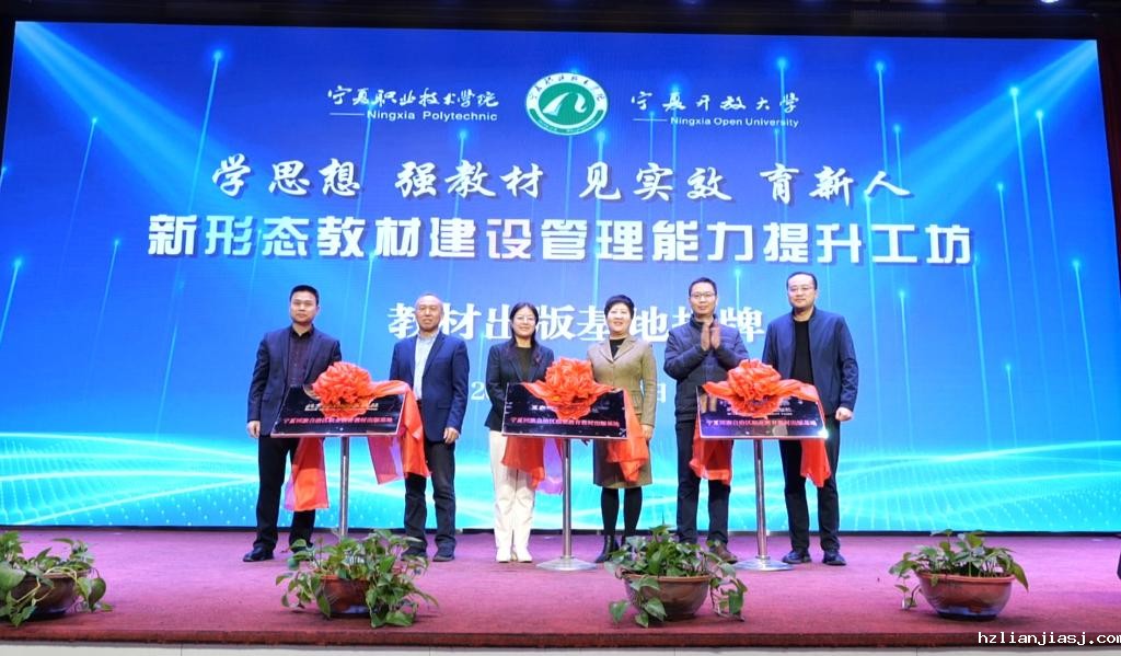 与会领导共同为北京理工大学出版社、西安交通大学出版社、国家开放大学出版社宁夏回族自治区职业教育教材出版基地揭牌