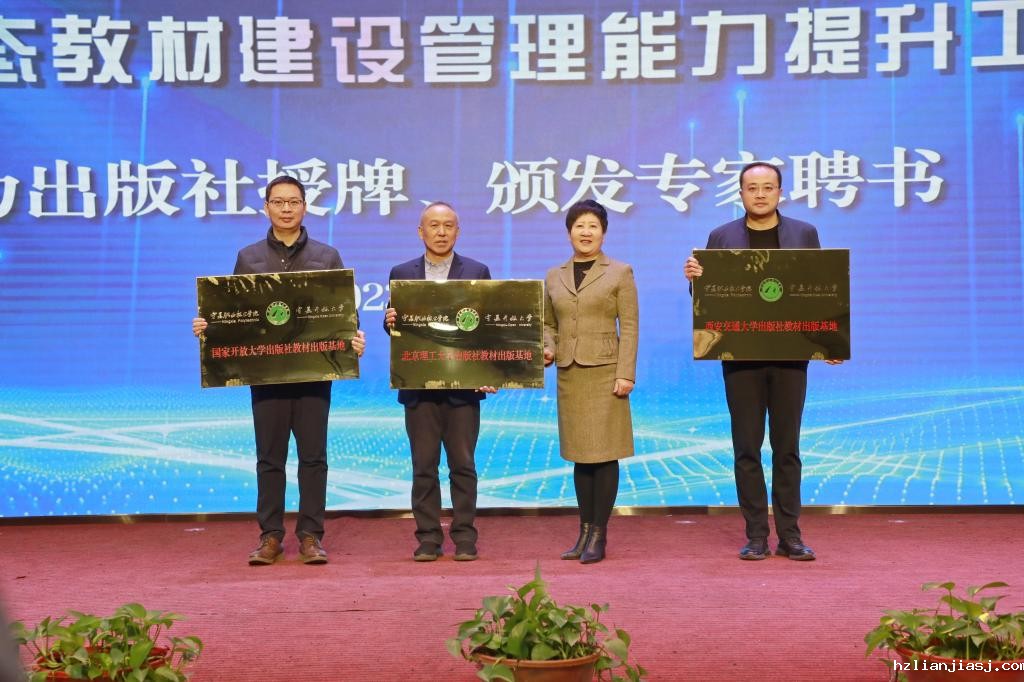 李晓延副校长代表学校为数字化教材开发专家代表颁发了聘书,并为韦德1946手机宁夏开放大学北京理工大学出版社、西安交通大学出版社、国家开放大学出版社教材出版基地授牌。