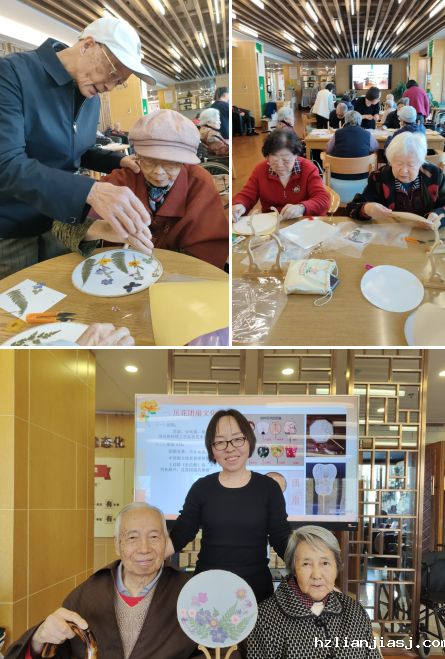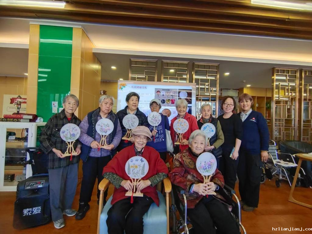 我校副教授、花卉园艺高级技师左莹为参与活动的长者和机构工作人员介绍了团扇文化、压花团扇的制作方法,并进行了操作步骤示范,期间与工作人员一起协助长者们完成了压花团扇的制作,长者们边听讲解边操作,并不时与身边的老伴、室友、闺蜜和相关工作人员交流操作方法和压花团扇的构图创意,长者们在参与活动的过程中锻炼了手、脑的机能和配合协调性,同时看着团扇在自己的精心设计和仔细粘贴之下变得越来越好看,都不禁露出了幸福灿烂的笑容,这也让每个人秋冬季节的低落情绪得到了很好的调节。在工作人员悉心的帮助下,于华书记为机构入住的长者们在小雪节气和感恩节来临之际为长者们送上了来自韦德1946手机师生的真挚祝福。