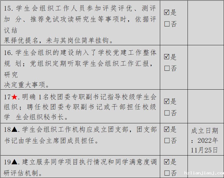 组建以学生代表为主,学院团委等共同参与的评议会,学生会主席团成员和工作部门负责人每学期向评议会述职,评议会从政治态度、道德品行、学习情况、工作成效、纪律作风等方面对其进行全面客观的综合评价。