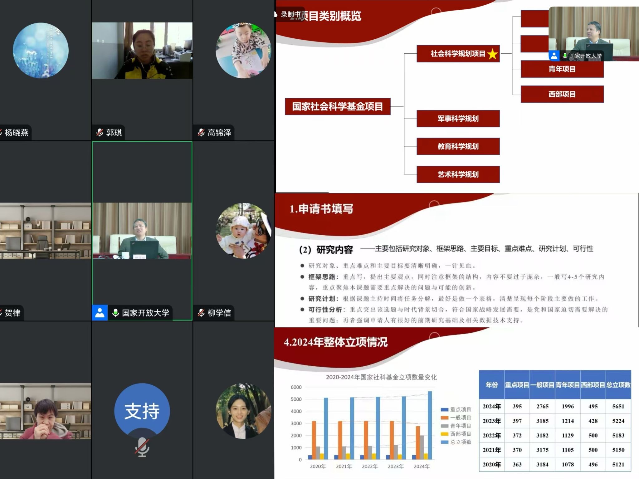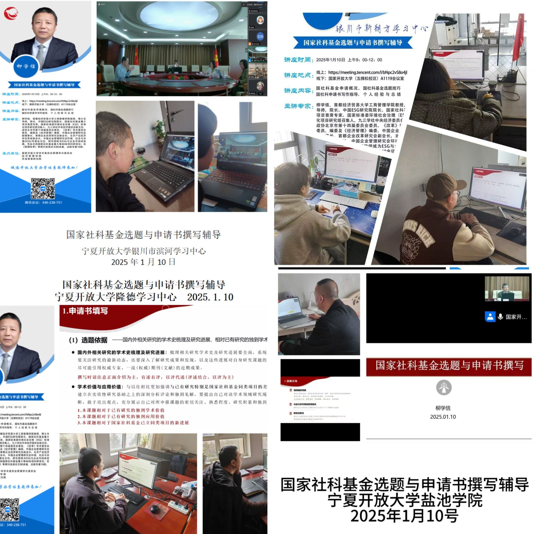 1月10日,远程学习支持服务中心精心组织了宁夏开放大学体系内的全体教师,共同收看国家开放大学《国家社科基金选题与申请书撰写辅导》直播培训。主讲专家是国家社科基金重大项目首席专家、中国ESG研究院的院长、首都经济贸易大学工商管理学院教授、博士生导师柳学信。从事开放教育的全部专兼职教师以及22个基层教学单位的教师参与培训。