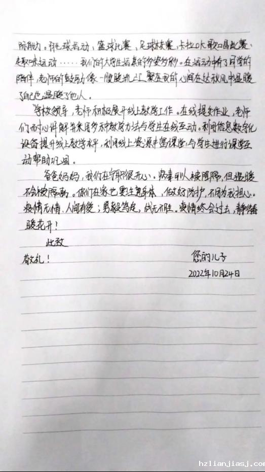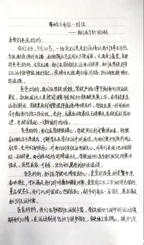 爸爸妈妈,我们在学校很暖心。学校实行封闭管理以来,学院多次组织开展主题班会,了解学生在学习生活中的困难。面对猝不及防的降温,学校组织老师为我们发放防寒衣物。爸爸妈妈,不用担心,离家虽一月有余,但这里也有着如同家一般的温暖。
