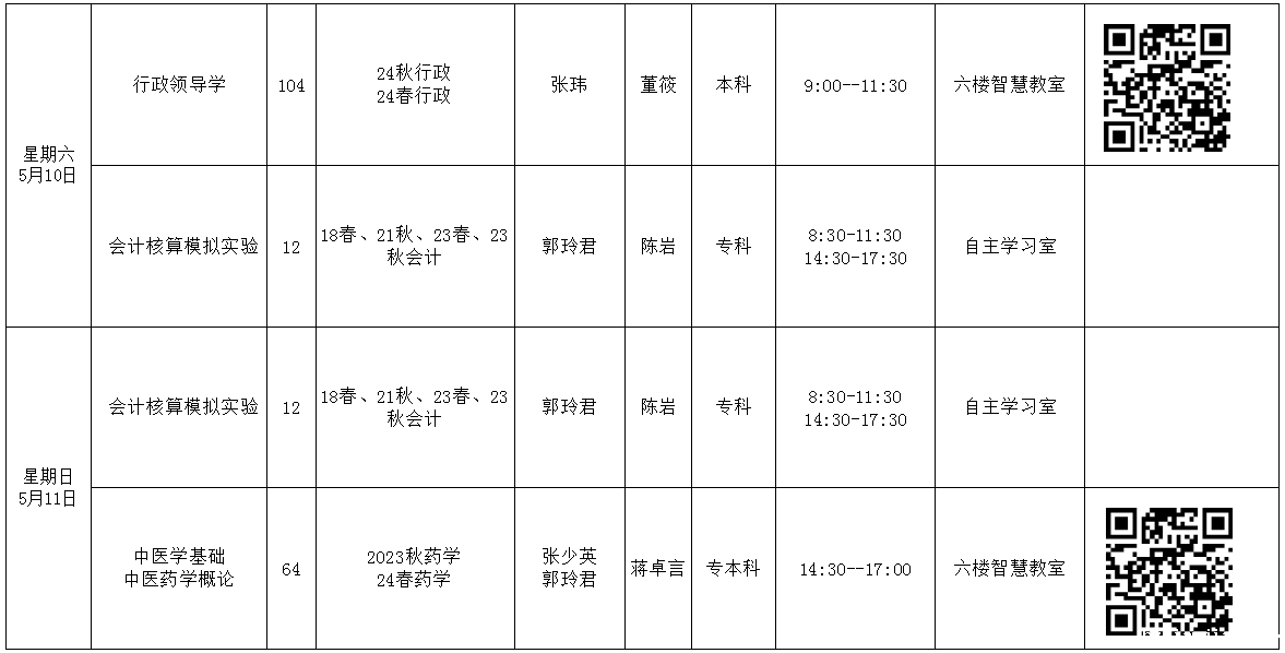 直属学院2025年春季学期第四周(5月5日—5月11日)课表