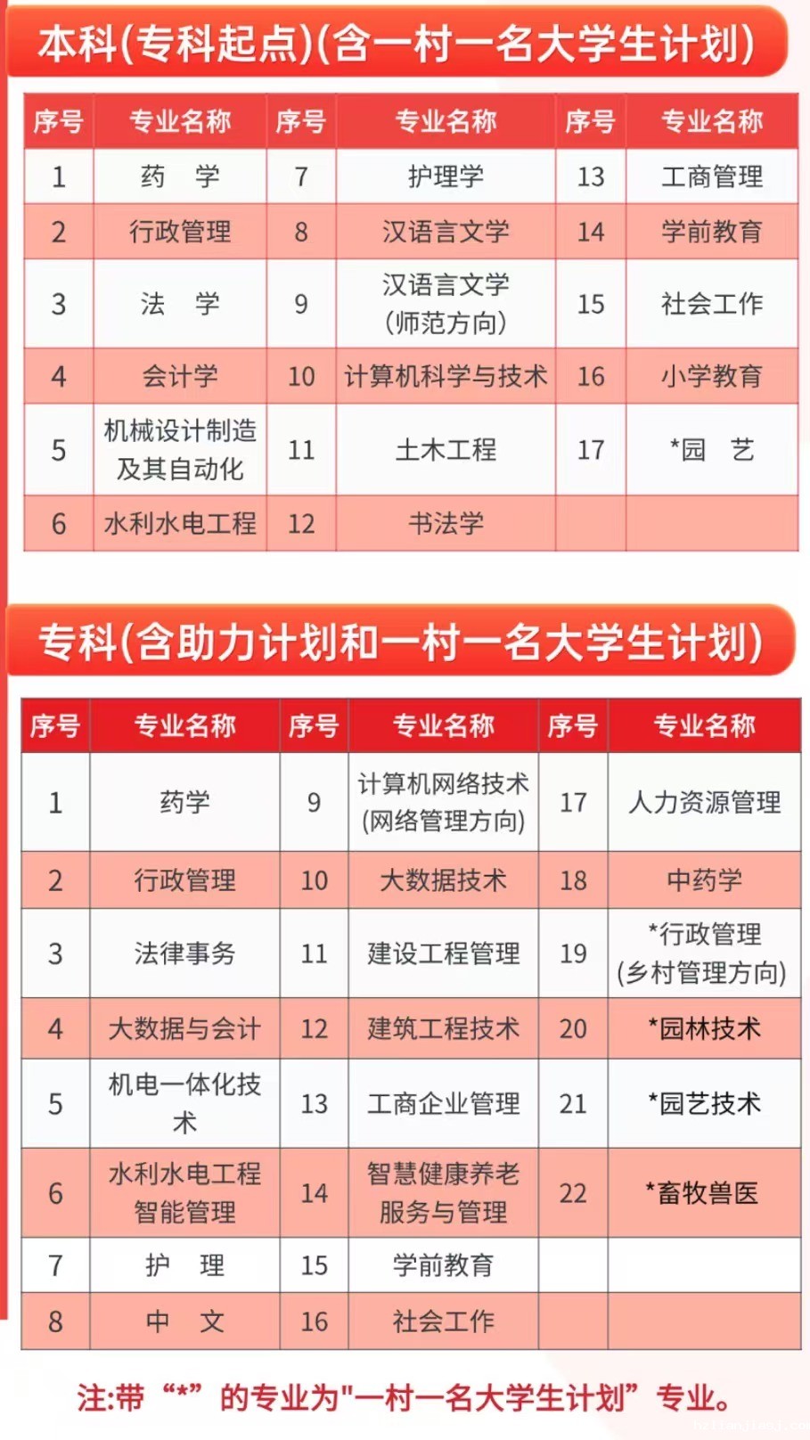4.“一村一名大学生计划”本科专业的招生对象为具有高等专科(含专科)以上学历的农村青年。